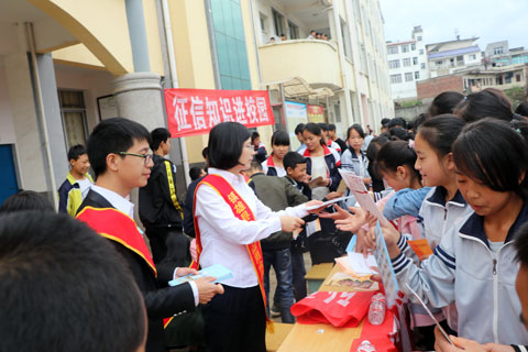 进农村、进商圈、进企业、进校园……工作人员还分别前往各乡镇中学,为孩子们呈上一道丰盛的“金融知识”大餐。违法违规的“校园贷”、电信网络诈骗案件剖析、网购支付安全防范……围绕新形势下的金融安全,问答互动、循循善诱。工作人员采取“孩子点菜、我们买单”的方式,解答孩子们的提问,让他们自觉远离违法违规借贷侵害,增强中学生金融风险防范意识。