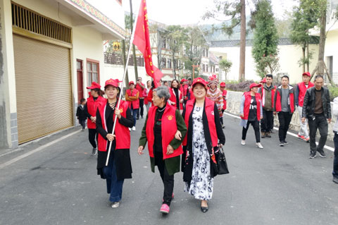在县总工会、团县委、县妇联和县文明办的倡导下,该村30余名热心公益事业的退休干部、留守妇女自愿成立了文明卫生服务志愿队,发挥老同志的余热、充分利用留守妇女空闲时间开展卫生服务工作。志愿队的宗旨是支持地方党委、政府工作,积极服务城乡环境综合整治,以“学习十九大,携手树新风,打造靓家园”为主题,走上街头,进社区、入学校,除陋习、树新风,以组织开展文艺宣传活动,对不良行为、风气进行文明劝导,散发宣传资料等各种形式,广泛宣传党的十九大精神,耐心向群众讲解宣传开展城乡综合治理的目的、意义,引导广大群众树立良好的文明卫生习惯,真正做到老有所乐、闲有所为。