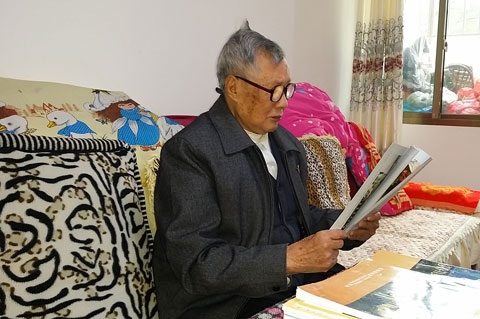 来到90岁的县委老干部局离休干部许光明老人家时,他正在看电视剧《飞哥战队》。他曾是一名抗美援朝老兵,对军事题材方面的电视剧比较感兴趣,也热衷于关注时事新闻。“无论如何我公公他身上都要穿着有‘警察’标志的衣服,头上戴的县离退休老干部视察重点工程纪念帽也舍不得拿下来,拿其他的给他换他不愿意。都是晚上他睡着了,我们又给他拿去洗干净弄干了第二天他又继续用。”据老人的儿媳李静介绍,老人有老年痴呆症,有时会连家人也不认识,但在他清醒时,都坚持去县委老干部局交党费、过组织生活。