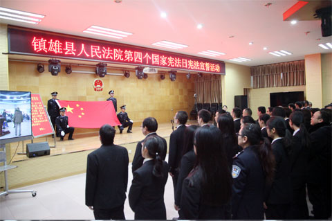 宣誓后,该院有关负责人发表题为《弘扬宪法精神,建设法治镇雄》的讲话说,我们应该用自己理性的思考来诠释对法的理解、对和谐的认识。“崇尚法治、铸造和谐”是当今时代的主旋律,是每一个身处于时代洪流中的人都应努力去践行的基本准则。作为法院干警,一定要在推进依法治县、构建法治镇雄和谐镇雄的历史征程中,抓住机遇,迎难而上,用法治铺设出一条无愧于时代的和谐之路。