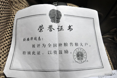 老刘名叫刘安华,1952年6月出生,居住在雨河镇黄坪村发达村民组,年轻时当过村民小组长。沾满泥斑的劳动服,灰色的长筒裤管一直卷过膝盖,干裂的双手、指甲里塞满了黑黑的泥土,饱经风霜的脸上布满了深深的皱纹、印下岁月的痕迹……这名生长在大山深处的农民,普通得再也普通不过,就像森林中的一颗老松树,但他是2011年“全国种粮售粮大户”荣誉称号获得者,得到国务院的表彰奖励。