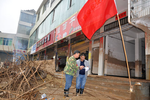 在街道的另一头,张毅俨然变成了三头六臂,一手敲门呼喊群众“逃命”,一手拿着电话不停地拨打着抢救生命的热线,打给村民小组长、打给中铁十二局、打给机关站所……由于是往顺流方向通知群众,刚通知了几户群众,洪水已经漫过了张毅的腰部。洪水中,张毅继续前行。“砰、砰、砰”一楼的卷帘门传来连绵不断的敲打声,伴随着张毅的呼喊,李鹏知晓了洪水的肆虐,赶紧起身组织一楼的群众撤到二楼。说时迟、那时快,李鹏家一楼门面里熟睡的七八个商贩被张毅的呼喊声惊醒。“我们听到张书记的呼喊,赶紧起床穿鞋,一脚伸下去,发觉水都漫上床沿了。”回忆起当时的情景,商贩们仍然心有余悸。