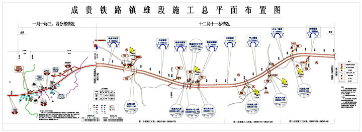 成贵铁路镇雄段工程分别由中铁一局和中铁十二局两家公司承建。中铁一局指挥部设在威信县城,施工标段是10标,全长约12.26公里。中铁十二局指挥部设在以勒镇,施工标段是11标,全长约26.633公里。