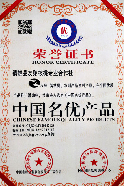 记者日前从镇雄县友贻核桃专业合作社获悉,在2014年度全国优质产品推广活动中,经中国名牌企业联合发展推广委员会、中国国际品牌调查中心联合审核,产自以古镇的“友贻”牌核桃成功入选《中国名优产品》名录。