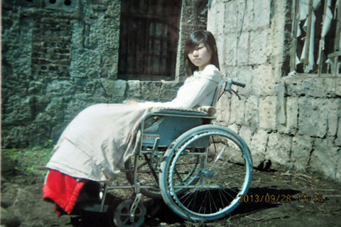 张红琼在自家房前坐在轮椅上