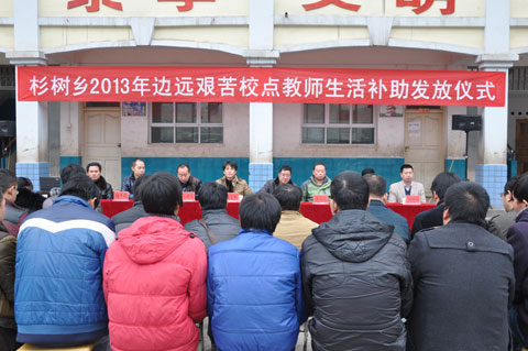 为贯彻落实好县政府、县教育局关于边远艰苦校点教师生活补助发放考核办法等精神,杉树中心校结合实际,制定了2013年边远艰苦校点教师生活补助发放考评实施细则,将在职在编、按新规定临时聘用、户口在县外且工作表现好、教学质量优秀的教师作为享受生活补助的条件,并按第一、二、三类校点每人2000元、3000元、4000元的标准进行发放。一年以10个月计算,每年2月、8月分两次发放。