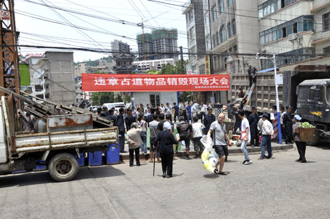27日上午,县城管局全员出动,对连日来联合执法查扣的物品进行集中统计,并在县人民会场举行“违章占道经营物品销毁现场大会”,堆积如山的手提秤、音响、衣物等大量查扣的物品,引来不少市民围观。