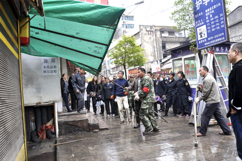 6月18日,我县城市环境综合整治拉开序幕,由公安、城管、工商、环保、武装、食药监、乌峰、南台、旧府等部门或街道办事处组成的联合执法队伍,从县城中山路开始,沿世贵街、南大街而下,拆雨棚、清“牛皮癣”、顺摊点、除路障……综合整治在合力奋战中动真碰硬。