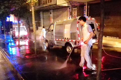 在交警部门清除街道两侧违章车辆的同时,城管部门也趁夜晚有利时机,组织力量对中山路、世贵街、南大街等主干道的车行道、人行道进行集中冲洗。大型洒水车、清洗车轮番上阵,冲洗车行道上的尘土、泥沙;小型清洗车则以两辆为一组,相互配合冲洗道路两侧人行道。冲洗过后,整条街道焕然一新。当晚,城管部门执法人员还对相关路段烧烤摊位进行了规范整治。