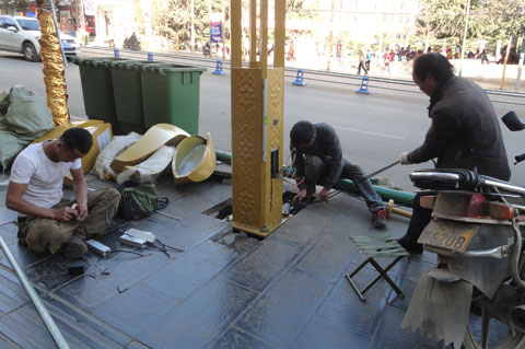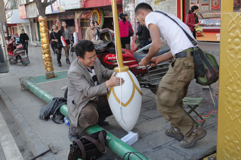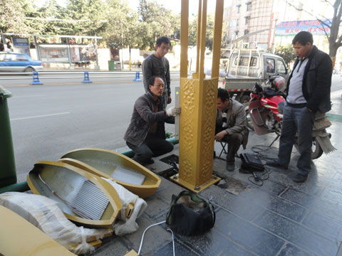 当日,在南大街,现场工作人员分工协作,他们有的在接路灯电线,有的在拧紧景观灯底座的螺丝钉,有的把灯杆中部的长形灯罩及顶端的灯叶小心安上。