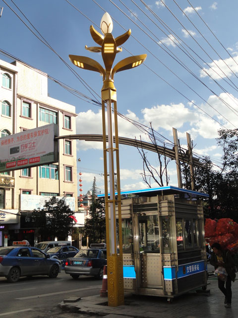 据现场工作人员介绍,南大街、西环路将安装约380处景观灯,灯柱约有6.8米高。现场安装的景观灯顶端是LED灯,灯柱中部在夜晚能看到彩色光。灯罩属于高分子材料,耐热又耐低温。一处景观灯从安装底座开始到立灯杆等工序,全部安装好通电、灯正常亮需两小时。“前天就开始安装这种景观灯了,属于带电作业,下雨天是不敢安的,如果天气好不下雨,预计要个半月才能安装完。现在有10多人参与安装。”