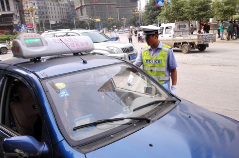 街心花园路段是此次交通秩序整治的重点路段,其四周均禁止随意停车。记者在此看到,多辆出租车无视后面长长的车队,随意停靠上下乘客,均被现场执法的交警当场给予处罚。