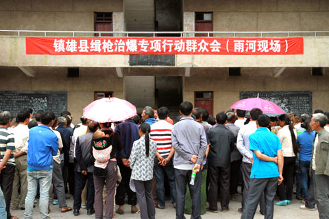 历年来,我县雨河镇及其他部分乡镇的一些村民组,村民都有打山(打猎)的习惯,一些村民往往可能会私制、私藏枪支弹药用于打山。8月6日,县委政法委组织县法院、检察院、公安等职能部门,在雨河镇乐利村高坎召开现场会,大力宣传私制、私藏枪支弹药的危害,同时表明党和政府收缴非法枪支弹药及爆炸物品的决心,掀起缉枪治爆专项行动专高潮。