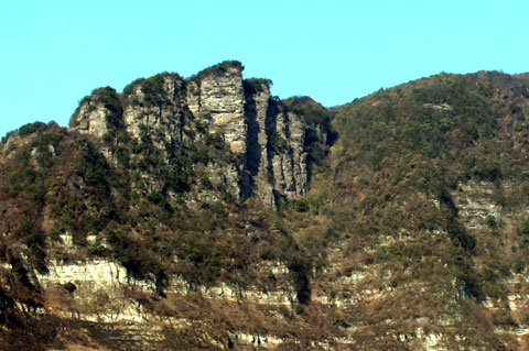 从正面看,“大岩”的几堵岩石,以东高西低、直立挺拔的模样,由前往后、均匀错开的形式,构成了一溜迎风招展的帅旗。