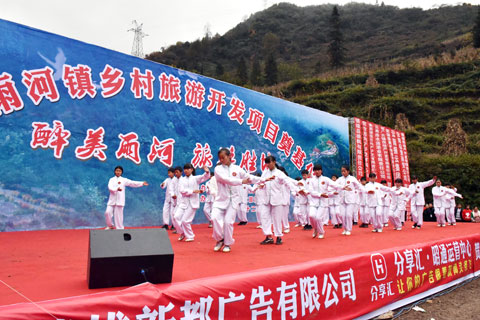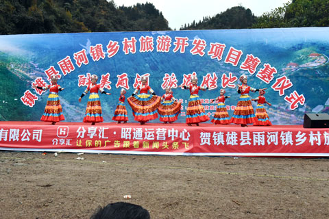 为庆祝旅游开发项目开工,仪式还举行了文艺演出。《我是镇雄人》《最美的太阳》《漂洋过海来看你》《敬酒歌》等动听的歌曲获得阵阵掌声,舞蹈《醉美雨河》《中国红》展现了雨河的热情好客和人民的幸福生活,小品《懒汉争当贫困户》反映了脱贫攻坚过程中干部的认真负责和贫困户对脱贫的期待,学生们的《太极拳》、合唱《明天会更好》让大家感受到了年轻人的朝气和未来。