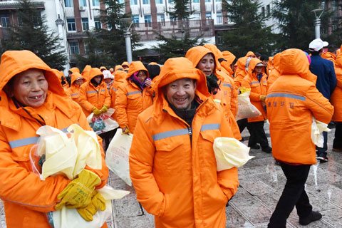 “今天穿起这衣服,心情特别的高兴,衣服特别的暖和。得到大家的关心,不管再苦再累我们都会尽心尽力,一定把环境卫生搞好。”穿上防寒服后,环卫工人成芝美难掩激动之情。
