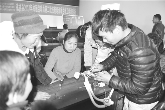 授人鱼不如授人以渔。为做到输血扶贫与造血扶贫相结合,有效帮助贫困户如期脱贫,镇雄县中屯镇青山村申请县人事劳动社会保障局和中屯镇党委政府支持,从12月1日开始,对村内贫困劳动力进行技能培训。据了解,本期培训时间为期15天,培训内容主要为水电工技能。图为技师在教学员连接电路。 通讯员 吴长宽 摄