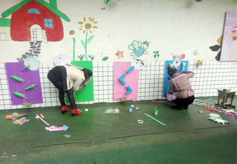 本网讯(通讯员 李世芳)12月23日,县第二幼儿园教职工利用周末休息时间,因地制宜,巧妙的把废旧物品利用起来,在园内布置成一幅幅美丽的图画,为幼儿创设美丽、益智、快乐的活动环境,让幼儿在与环境的互动中得到成长。